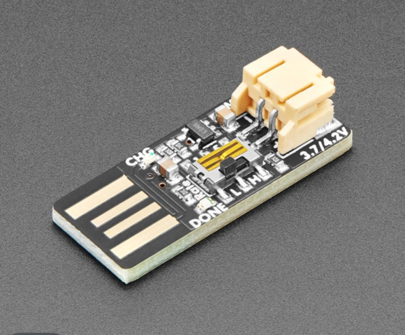 *From Adafruit: Oh so adorable, this is the tiniest little lipo charger, so handy you can keep it any project box! Its also easy to use. Simply plug in the gold plated contacts into any USB port and a 3.7V/4.2V lithium polymer or lithium ion rechargeable battery into the JST plug on the other end. There are two LEDs - one red and one green. While charging, the red LED is lit. When the battery is fully charged and ready for use, the green LED turns on. Seriously, it could not get more easy.