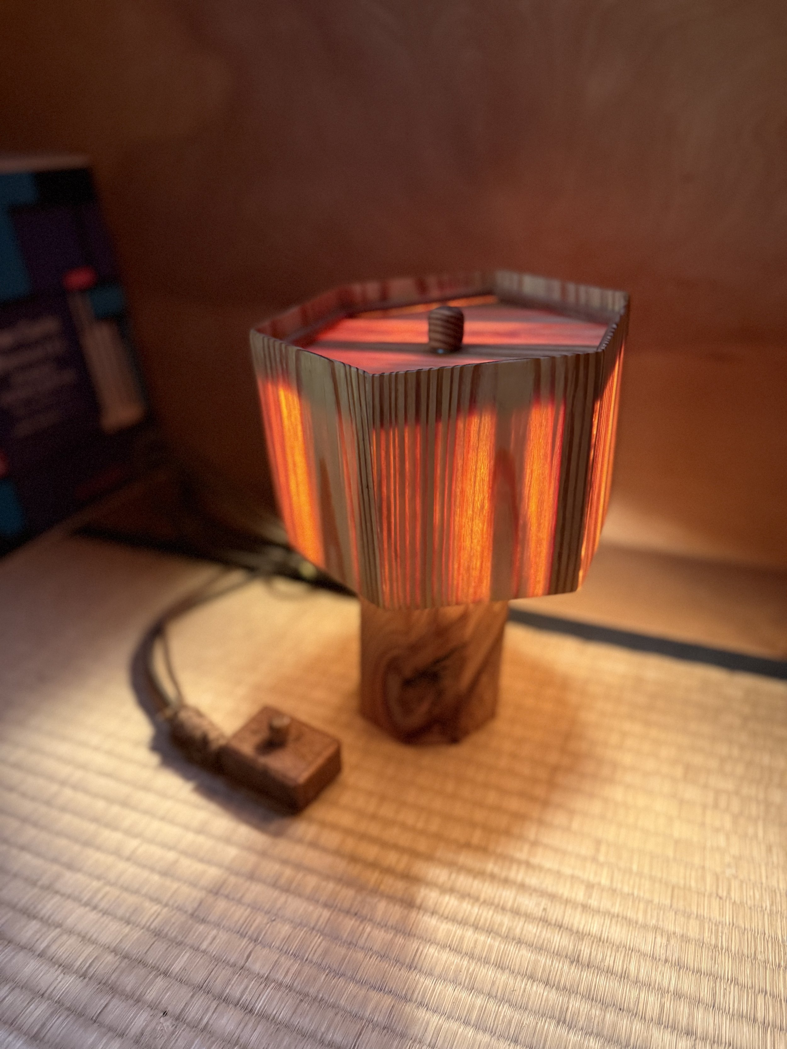 Longleaf Pine, hexagon shade, top panel mounted to lamp frame, lamp hardware