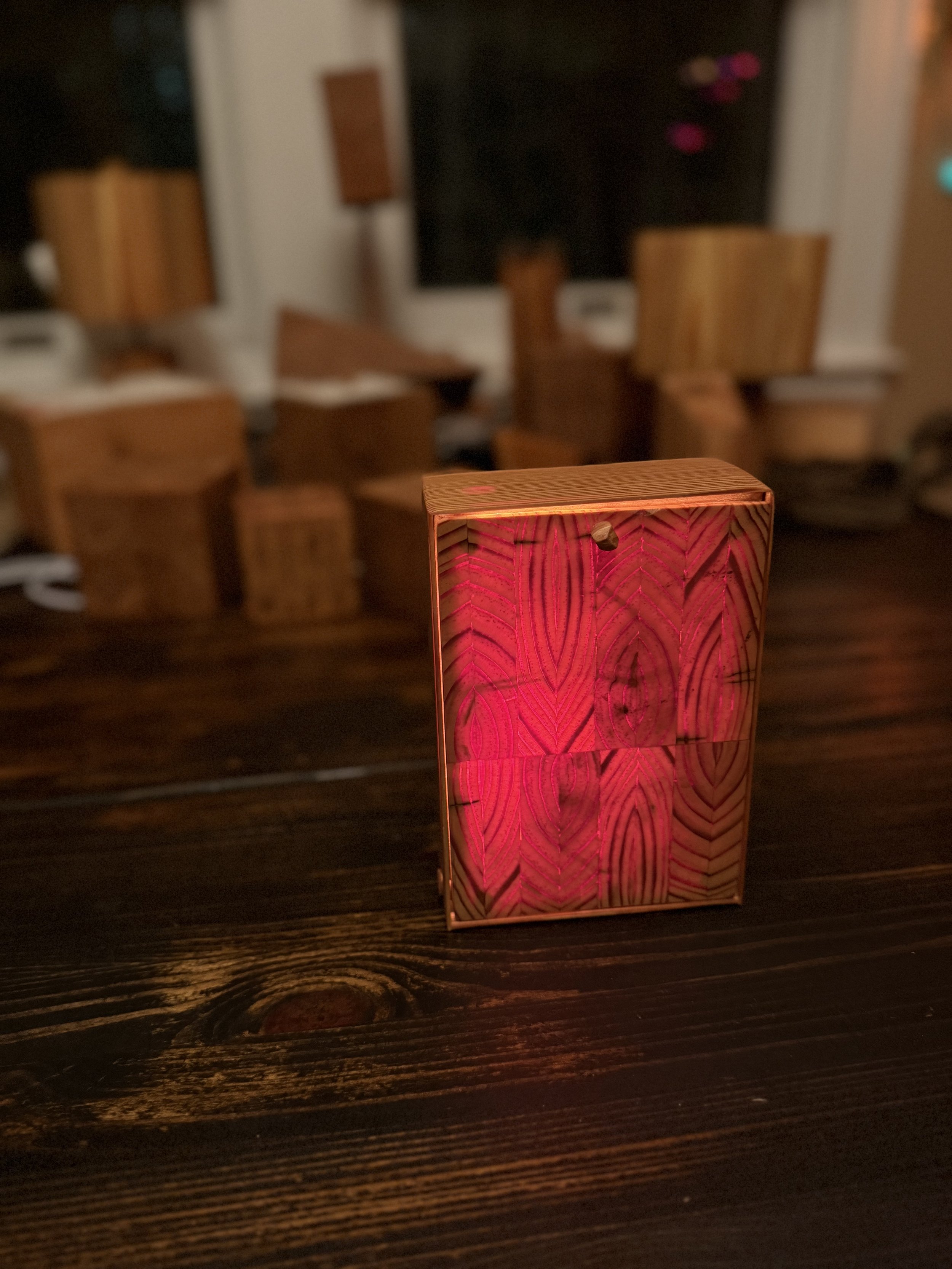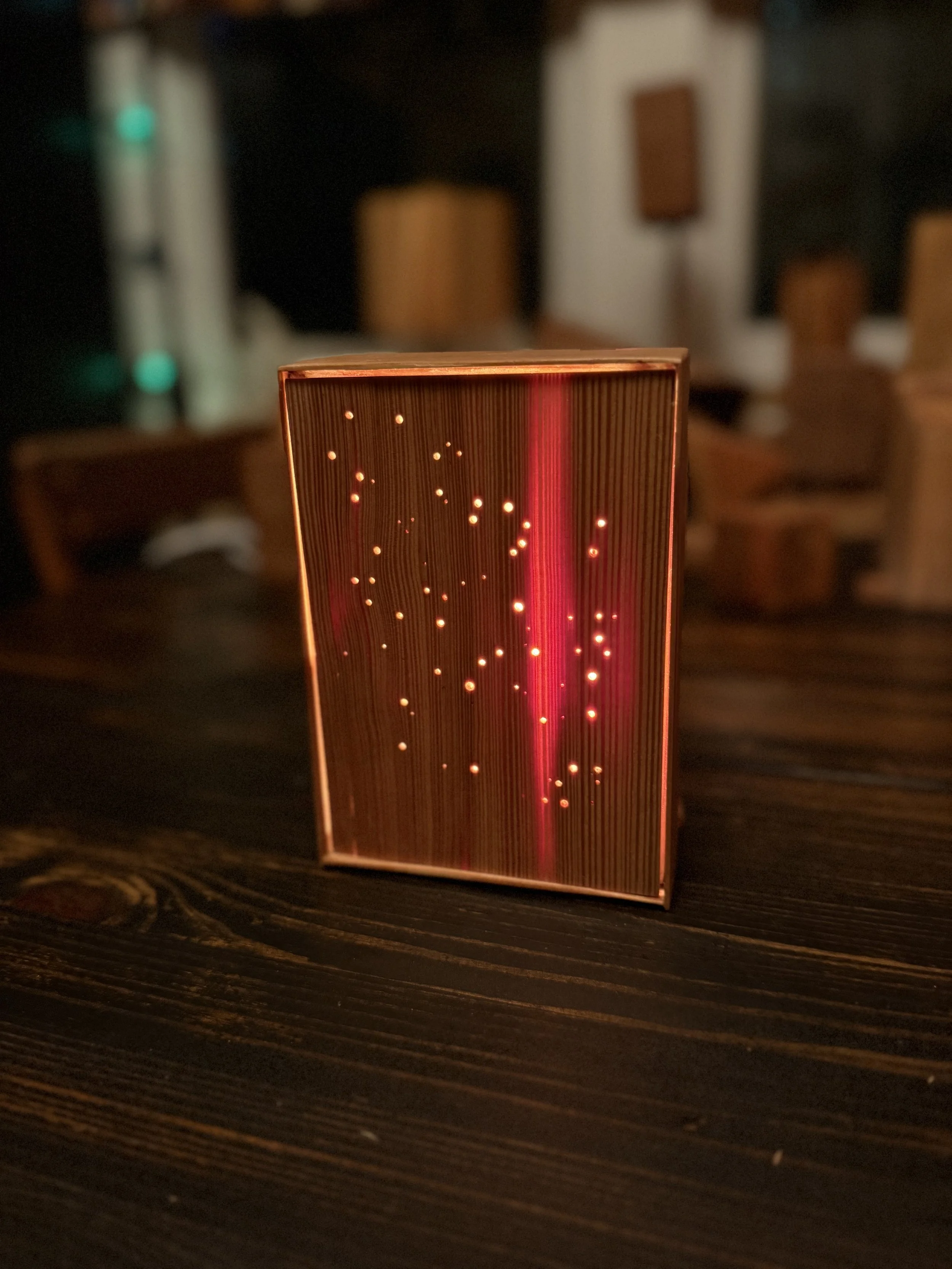 One face shows constellation “Hercules” with translucent stones (inside panel) which diffuses the light. The other panel is marqueted leaf of vulva like images (with wooden knob for removal).