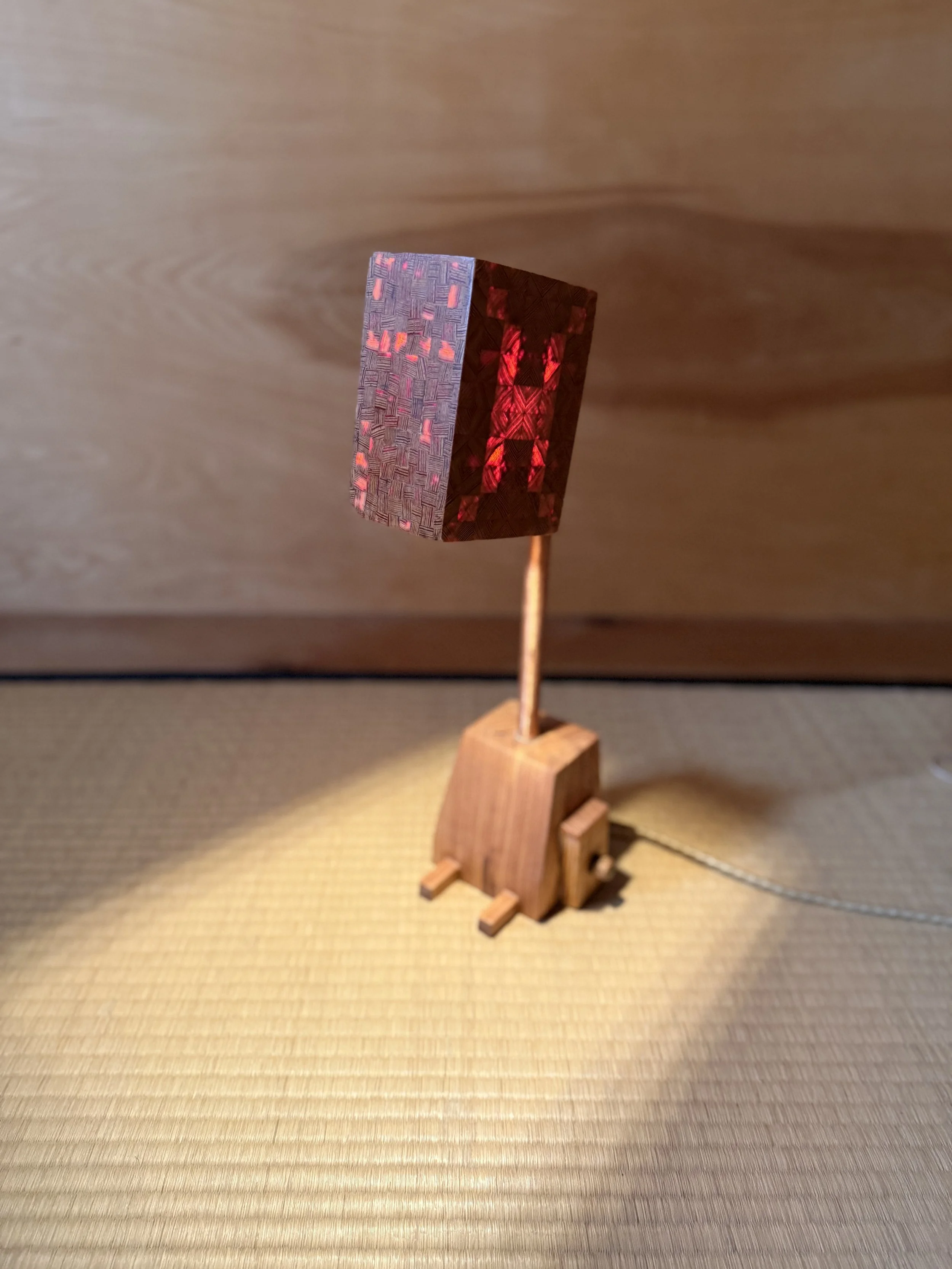 Longleaf Pine, marquetry, copper neck post, built-in dimmer, lamp hardware